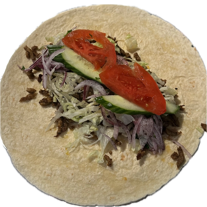 Fijngesneden kalfsvlees, gewokt met specerijen en geserveerd in een durum.